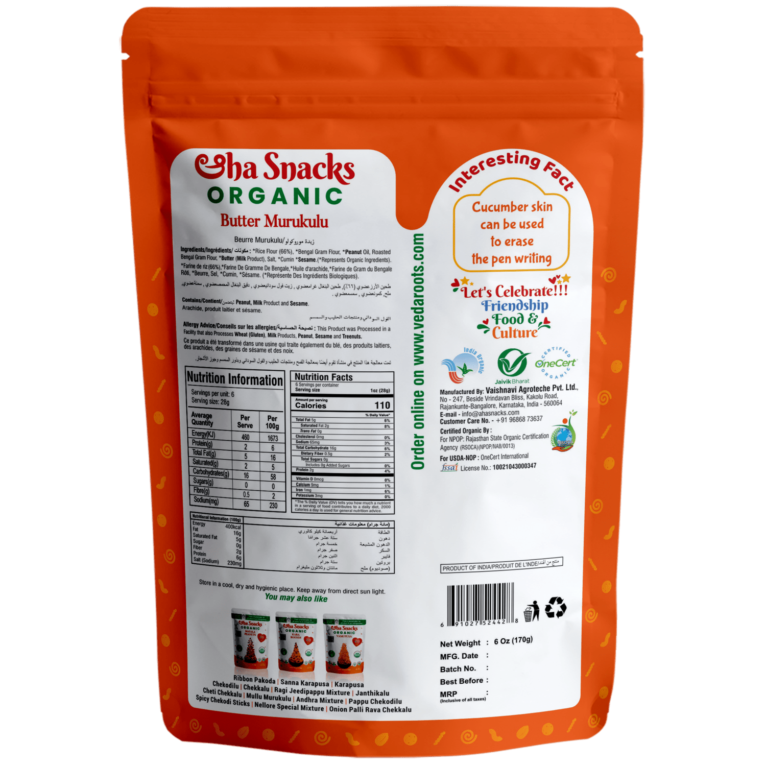 | Traditional Shape and Texture: Spiral-shaped snack with a soft crunch and mildly rich taste due to the butter content. 100% USDA Certified – Made using fully traceable ingredients that meet global standards. No shortcuts, no compromise. Cold-Pressed Peanut Oil, No Palm Oil – Fried exclusively in premium cold-pressed peanut oil for better flavour and a clean, non-greasy finish. No inflammatory seed oils. No Preservatives, No Chemicals, No Nasties – Absolutely no artificial colours, flavours, additives, or pesticide residues. Just clean ingredients you can trust. Crispy, Crunchy, Non-Greasy – Each spiral is light, airy, and crisp without being oily or heavy. Perfect with chai, cocktails, or just as a mid-day pick-me-up. |