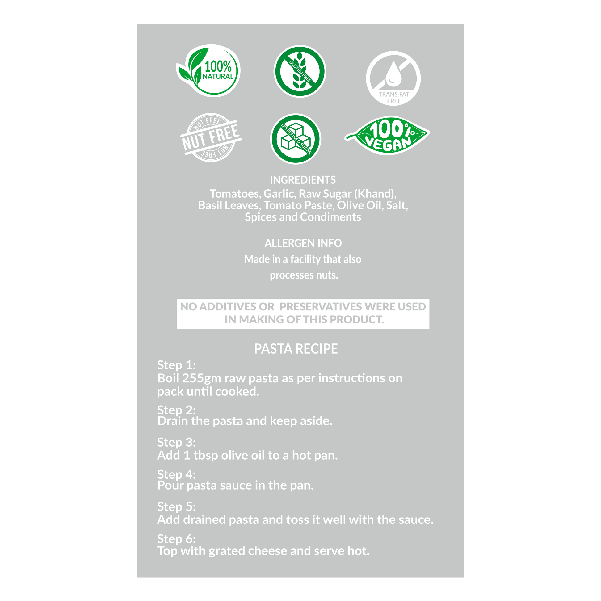 Ingredients: Tomatoes(84.9%), Raw Sugar(Khand-3.9%), Garlic, Basil Leaves, Tomato Paste, Olive Oil, Salt, Spices and Condiments