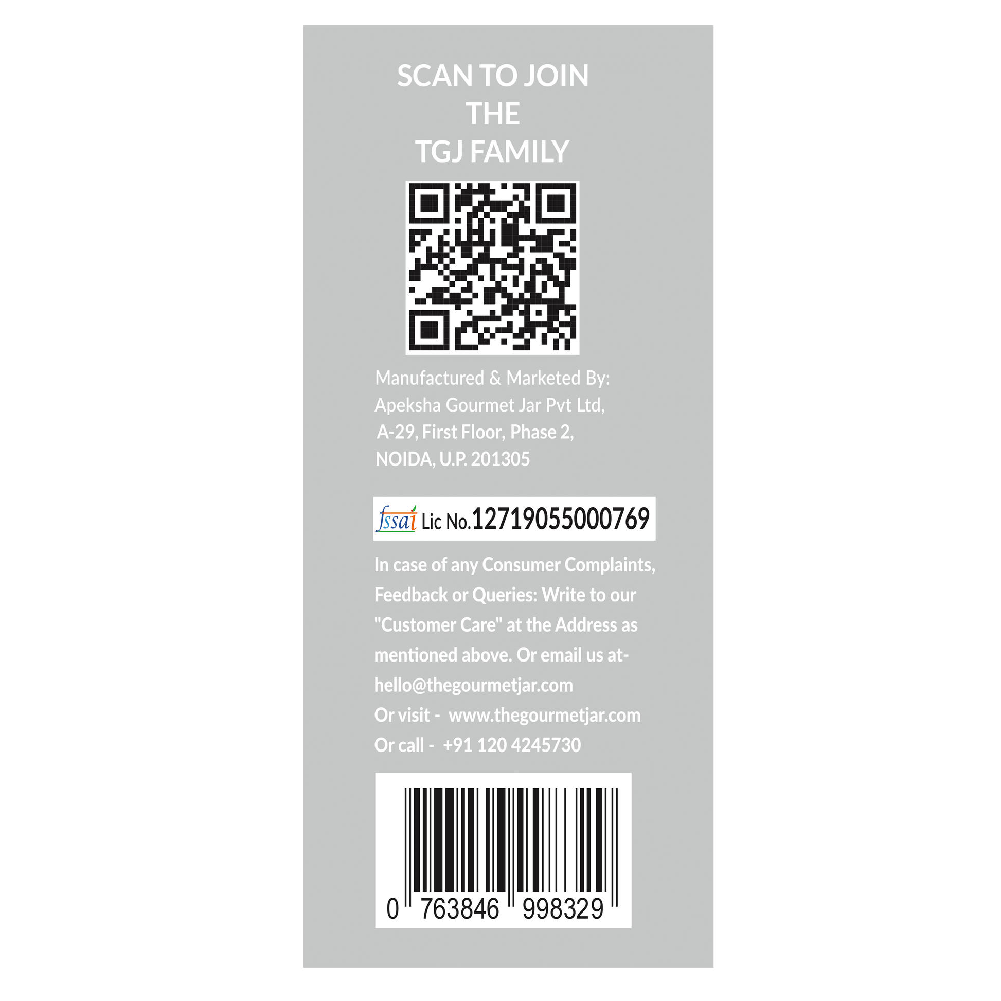 In case of any Consumer Complaints, Feedback or Queries: Write to our 'Customer Care' at the address as mentioned above. Or email us at- hello@thegourmetjar.com Or visit - www.thegourmetjar.com Or call - +91 1204245730