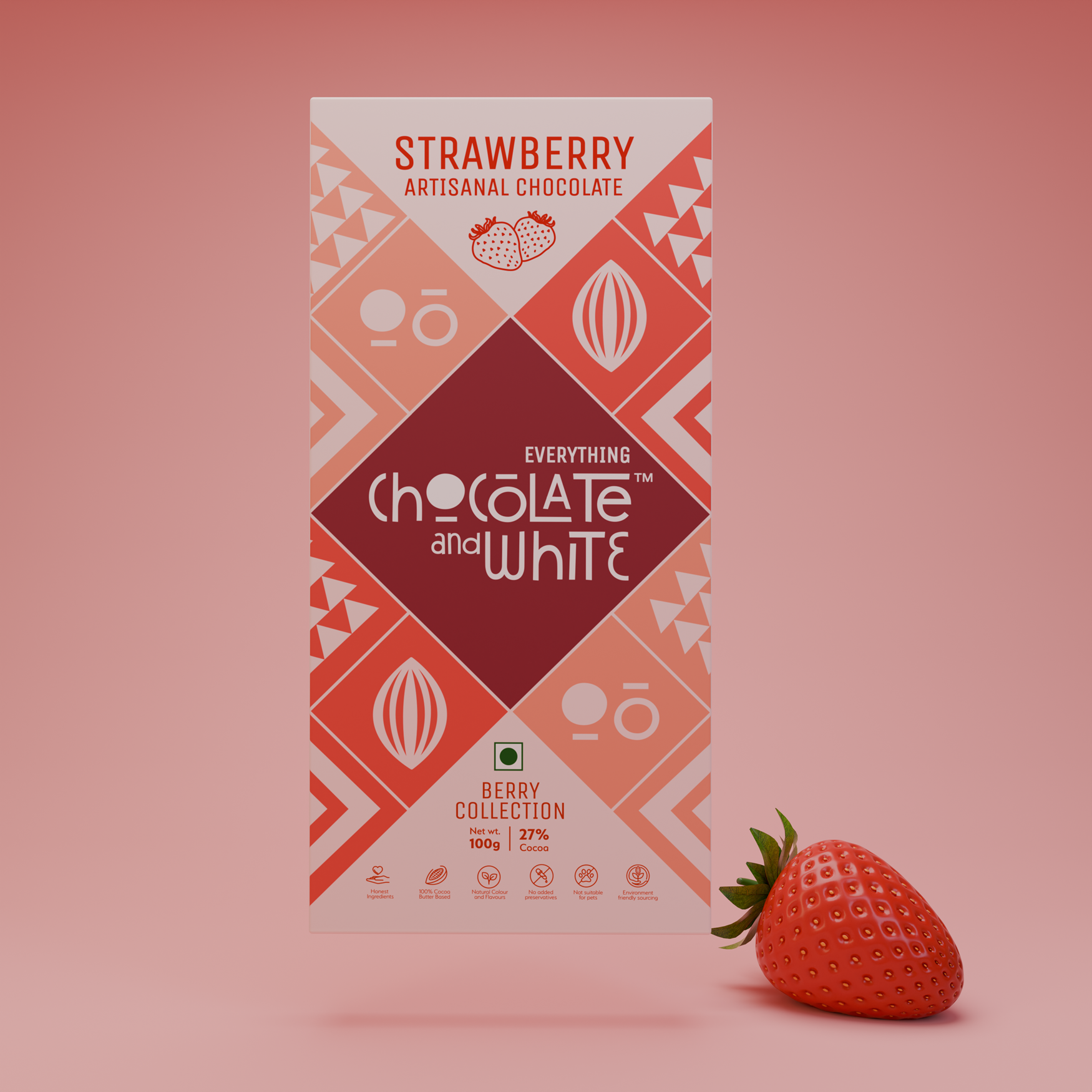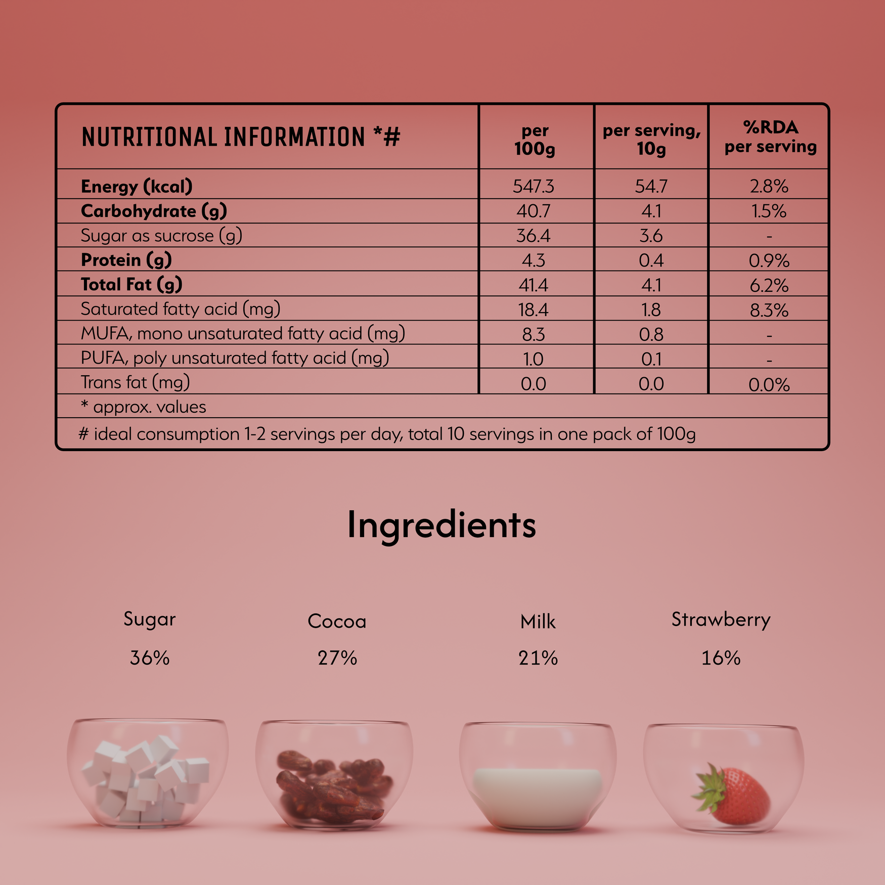 - 23% Cocoa Butter, 4% Cocoa Solid, 21% Milk, 16% Strawberry, 36% Sugar