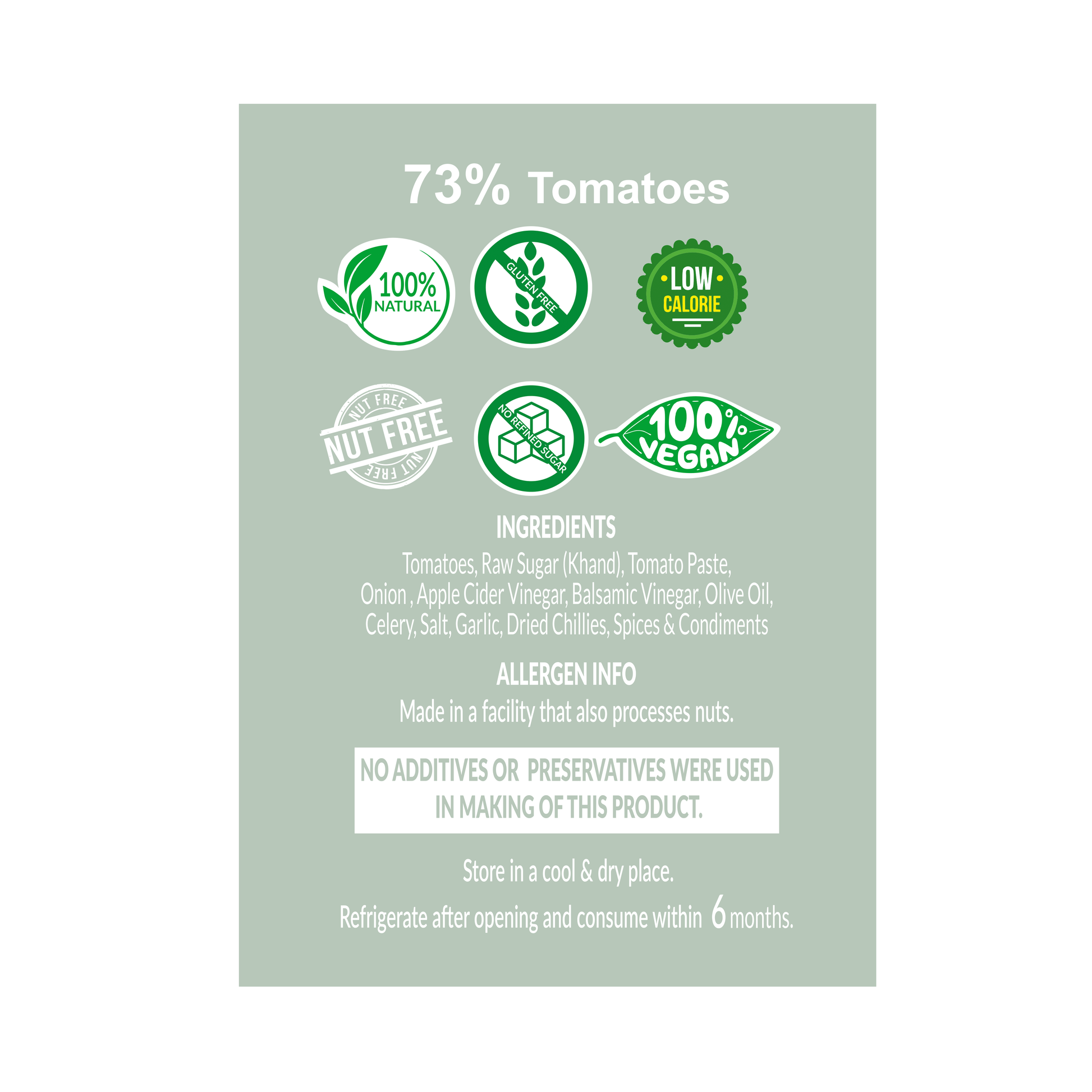 Ingredients: Tomatoes(66.6%), Raw Sugar (Khand-8%), Tomato Paste, Onion, Apple Cider Vinegar, Olive Oil, Celery, Salt, Balsamic Vinegar, Garlic, Dried Chilies, Spices & Condiments