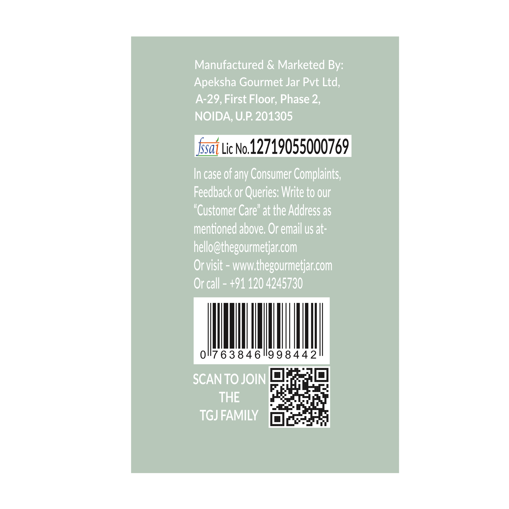 In case of any Consumer Complaints, Feedback or Queries: Write to our 'Customer Care' at the address as mentioned above. Or email us at- hello@thegourmetjar.com Or visit - www.thegourmetjar.com Or call - +91 1204245730