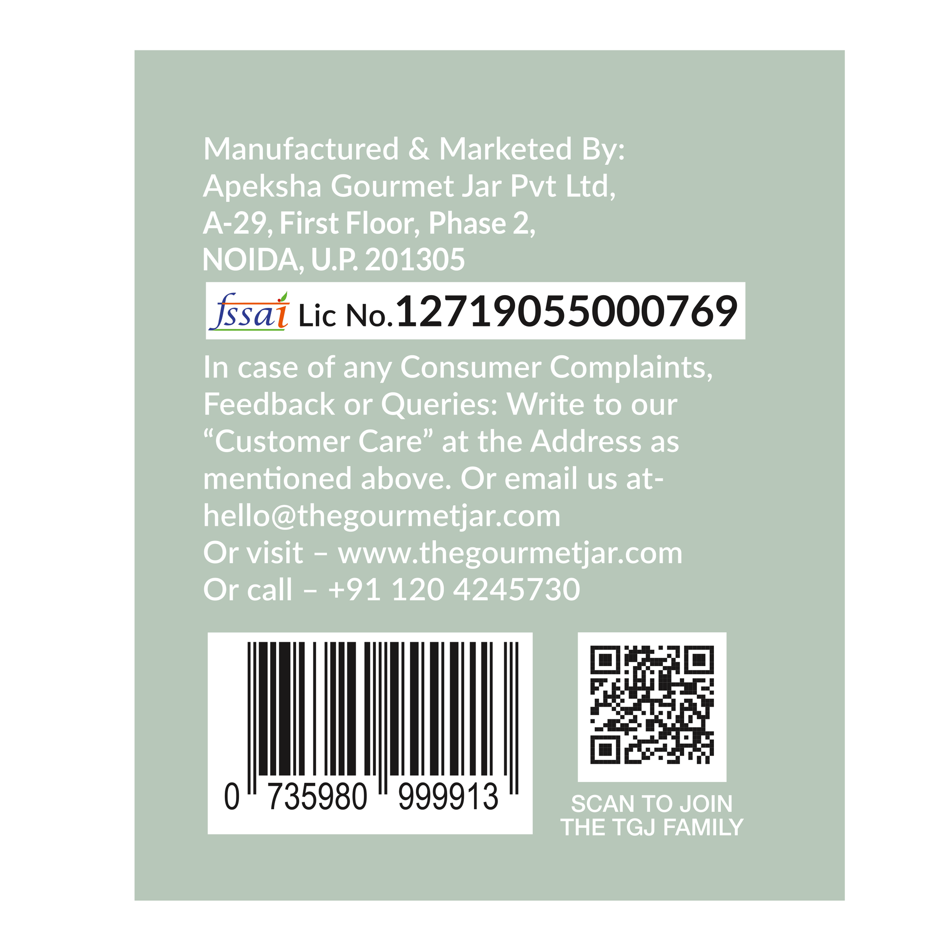 In case of any Consumer Complaints, Feedback or Queries: Write to our 'Customer Care' at the address as mentioned above. Or email us at- hello@thegourmetjar.com Or visit - www.thegourmetjar.com Or call - +91 1204245730