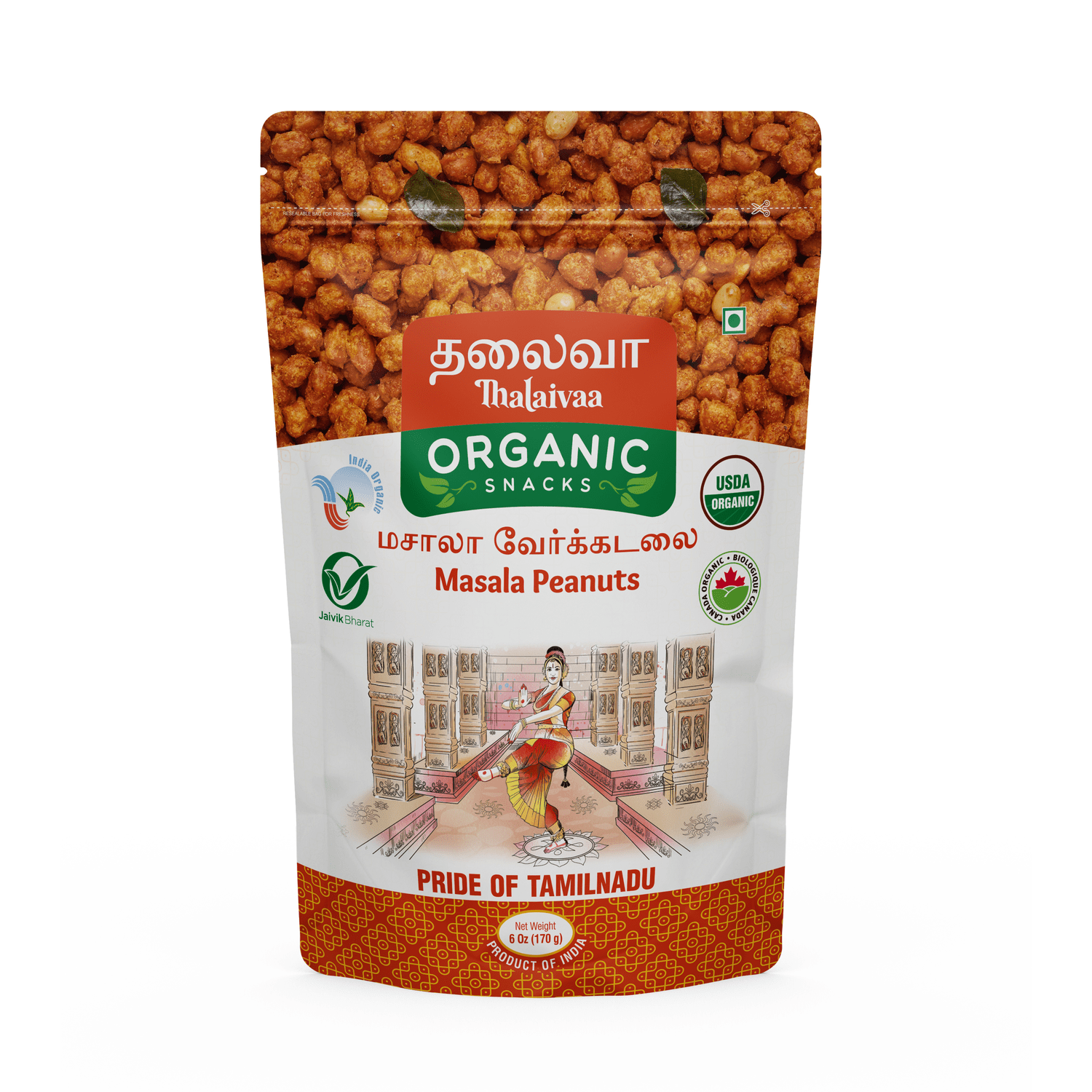 | Coated Nut Texture: Peanuts coated in a crisp spiced flour layer for added crunch and flavor. Cold-Pressed Peanut Oil, No Palm Oil – Fried exclusively in premium cold-pressed peanut oil for better flavour and a clean, non-greasy finish. No inflammatory seed oils. 100% USDA Certified – Made using fully traceable ingredients that meet global standards. No shortcuts, no compromise. No Preservatives, No Chemicals, No Nasties – Absolutely no artificial colours, flavours, additives, or pesticide residues. Just clean ingredients you can trust. Crispy, Crunchy, Non-Greasy – Each spiral is light, airy, and crisp without being oily or heavy. Perfect with chai, cocktails, or just as a mid-day pick-me-up. Shelf-Stable, Travel-Friendly Packaging – Packed hygienically in a food-safe pouch to retain freshness and crunch for weeks. Resealable and mess-free. Proudly Indian. Loved Globally – Thalaivaa brings the taste of real South India to snack aisles around the world. |