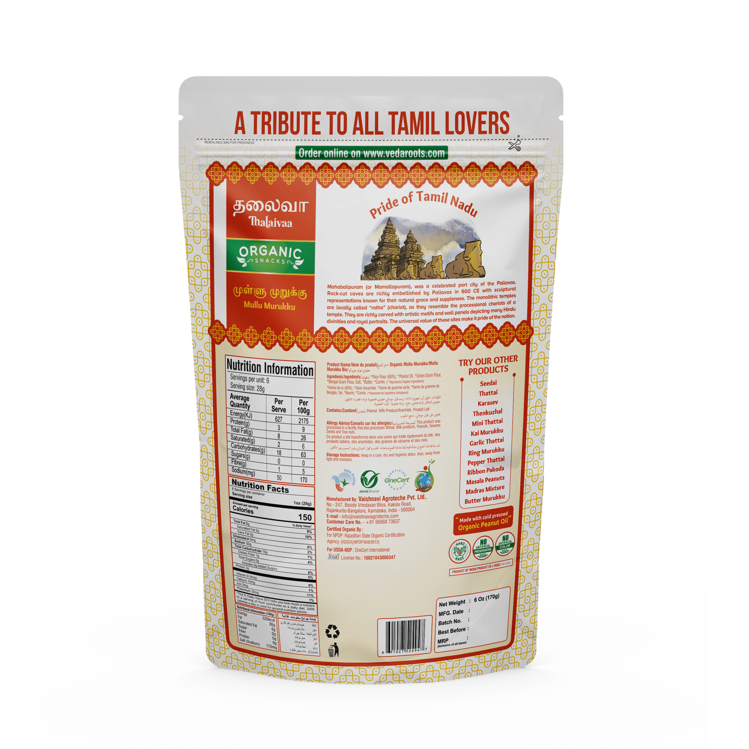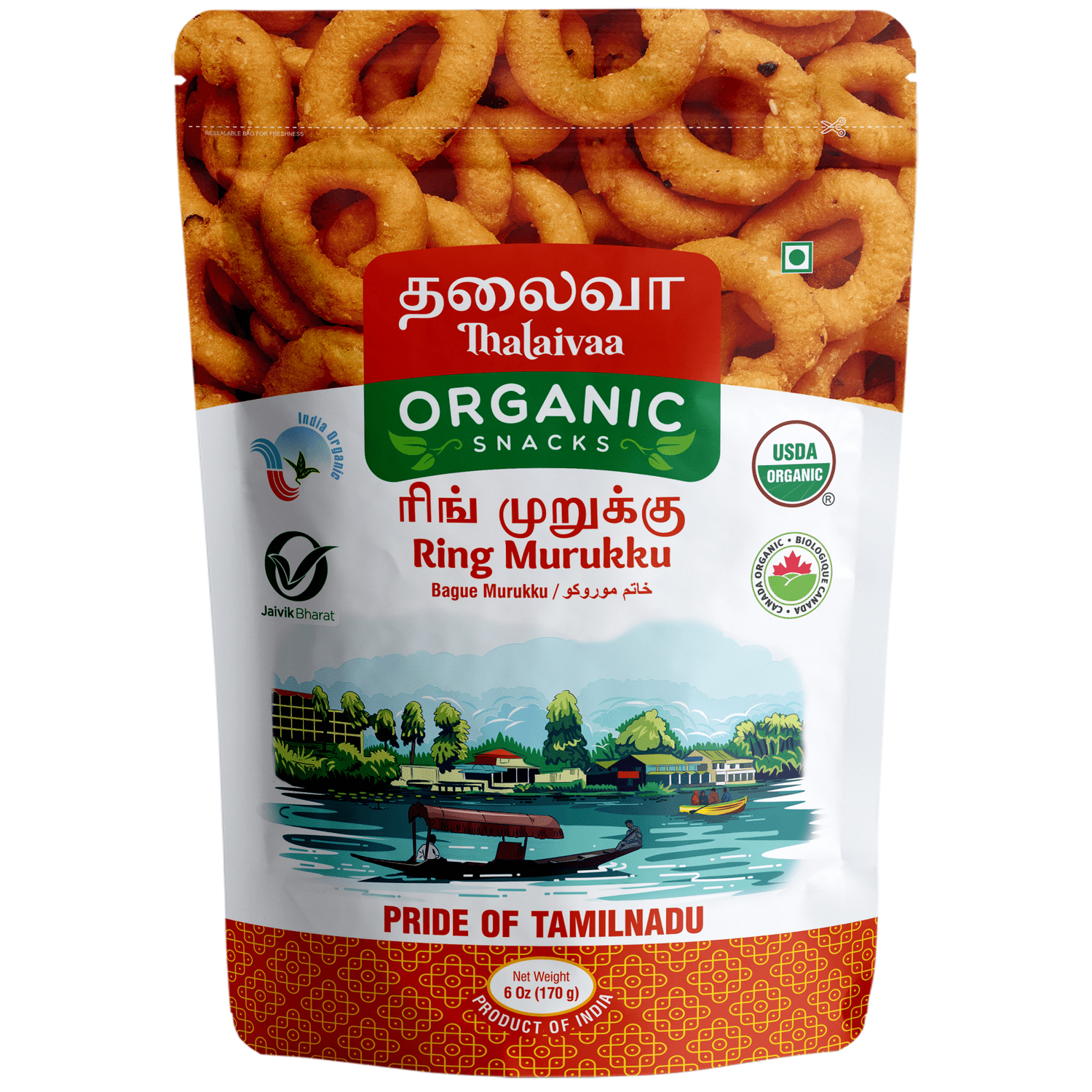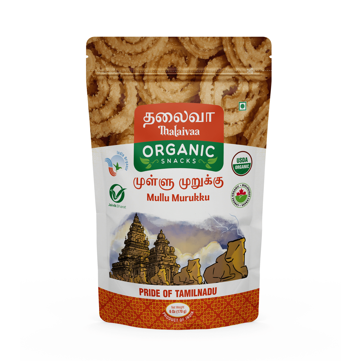 | Spiral Structure: Thick, serrated spirals shaped with a star-shaped mold for visual appeal. Cold-Pressed Peanut Oil, No Palm Oil – Fried exclusively in premium cold-pressed peanut oil for better flavour and a clean, non-greasy finish. No inflammatory seed oils. 100% USDA Certified – Made using fully traceable ingredients that meet global standards. No shortcuts, no compromise. No Preservatives, No Chemicals, No Nasties – Absolutely no artificial colours, flavours, additives, or pesticide residues. Just clean ingredients you can trust. Crispy, Crunchy, Non-Greasy – Each spiral is light, airy, and crisp without being oily or heavy. Perfect with chai, cocktails, or just as a mid-day pick-me-up. Shelf-Stable, Travel-Friendly Packaging – Packed hygienically in a food-safe pouch to retain freshness and crunch for weeks. Resealable and mess-free. Proudly Indian. Loved Globally – Thalaivaa brings the taste of real South India to snack aisles around the world. |